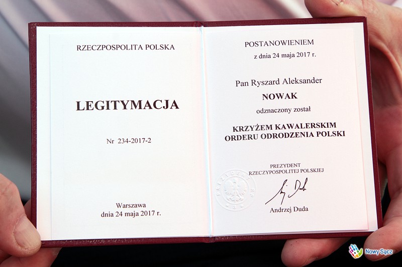 Podczas odbywającego się w Pałacu Prezydenckim Dnia Samorządu Terytorialnego, Prezydent Nowego Sącza Ryszard Nowak odebrał z rąk Prezydenta RP Andrzeja Dudy Krzyż Kawalerski Orderu Odrodzenia Polski - Polonia Restituta. To order ustanowiony w 1921 roku i nadawany za wybitne zasługi położone w służbie państwu i społeczeństwu, a zwłaszcza za wybitne osiągnięcia w działalności publicznej, podejmowanej z pożytkiem dla kraju.