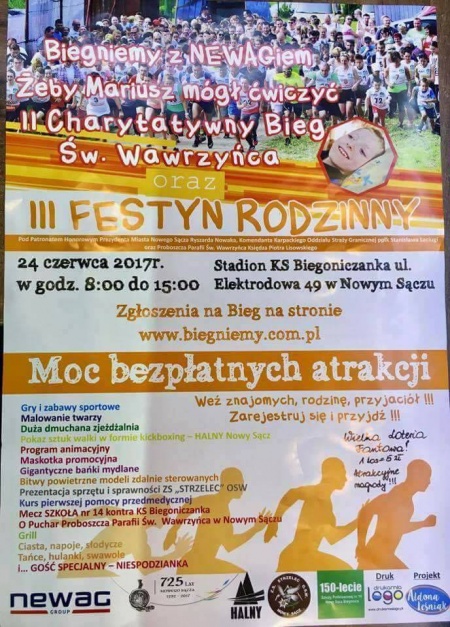 Z ogromną radością informujemy, że i w tym roku firma NEWAG za każdego uczestnika biegu przekaże pieniądze na 5 minut rehabilitacji dla Mariusza.