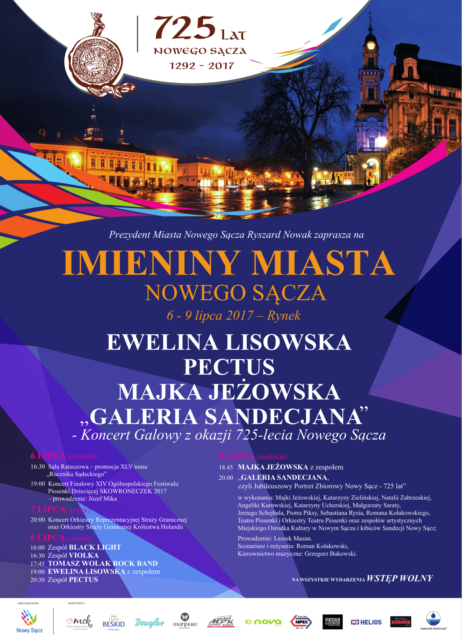 Już dzisiaj (9 lipca) na sądeckim Rynku o godz. 18:45 odbędzie się koncert Majki Jeżowskiej, a głównym wydarzeniem wieczoru (godz. 20:00) będzie spektakl historyczny Romana Kołakowskiego pt. "Galeria Sandecjana", odwołujący się do współczesności miasta i jego mieszkańców.. Całość zakończy widowiskowy pokaz sztucznych ogni!