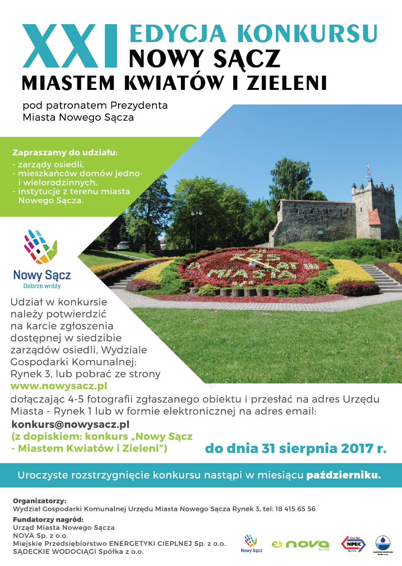 Pod patronatem Prezydenta Miasta Nowego Sącza Ryszarda Nowaka odbędzie się 21. edycja konkursu "Nowy Sącz - Miastem Kwiatów i Zieleni". Konkurs ma charakter otwarty i obejmuje wszystkich mieszkańców domów jedno- i wielorodzinnych oraz jednostki organizacyjne, mające siedzibę na terenie Miasta, które zgłoszą swój udział w terminie do dnia 31. sierpnia 2017 r.