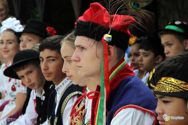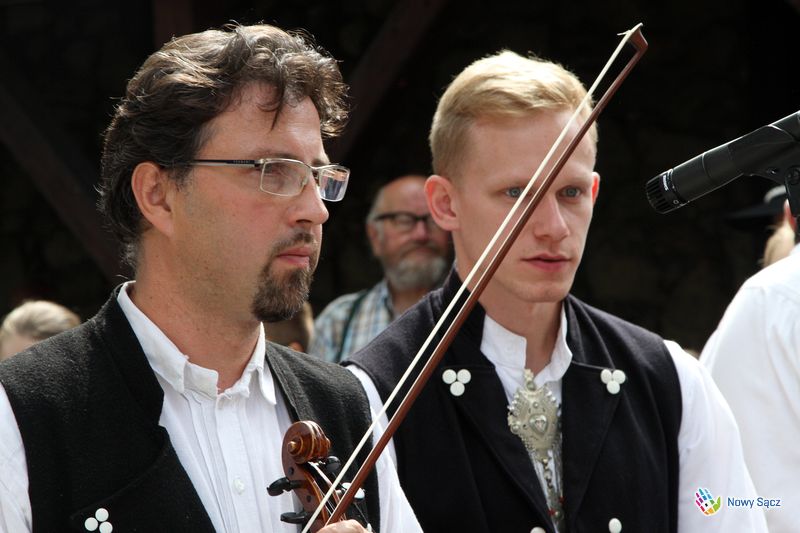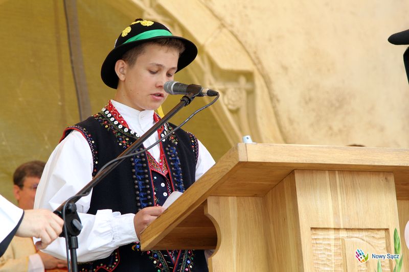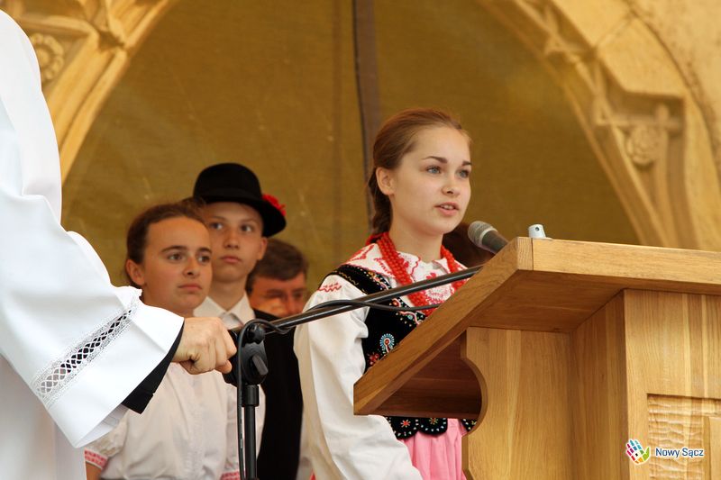 Kapelan festiwalu, ks. dr Stanisław Kowalik, nazwał bazylikę sądecką górą Tabor, gdzie spotykają się organizatorzy i uczestnicy festiwalu. – Przychodzomy do Boga, który jest ojcom syćkich dzieci na cołym świecie – mówił piękną łącką gwarą ks. Kowalik. – Ta dzisiejso ewangelia przypomino nom, ze kozdy z nos jest dzieckom Królestwa Bozego. My tutaj czerpiomy siły, moc do radości, do śpiwu, tońca i do nasych kamrackich spotkań.