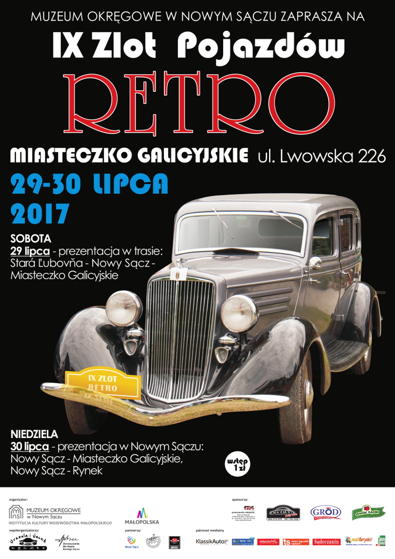 Muzeum Okręgowe w Nowym Sączu zaprasza na IX Zlot Pojazdów Retro, który odbędzie się w dniach 29-30 lipca 2017 w Miasteczku Galicyjskim (ul. Lwowska 226). Partnerem tego wydarzenia jest miasto Nowy Sącz.