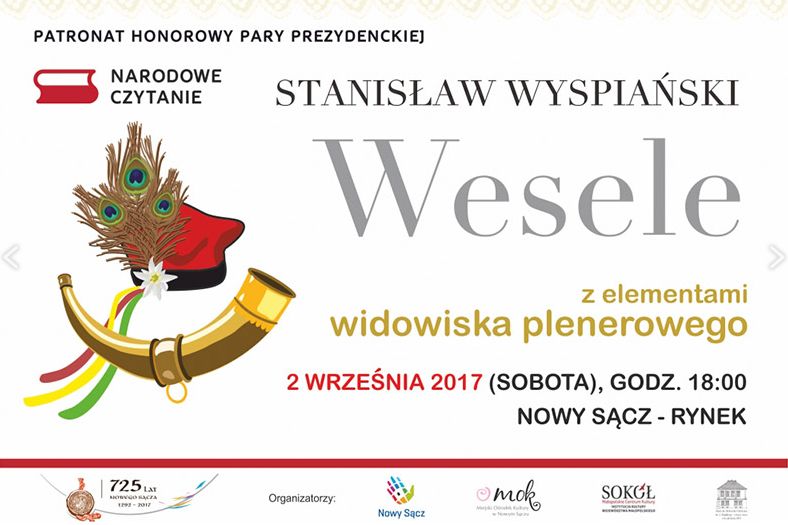 Narodowe Czytanie w Nowym Sączu. W najbliższą sobotę (2 września) na nowosądeckim rynku odbędzie się finał akcji pod patronatem Pary Prezydenckiej, mającej na celu poszerzanie znajomości literatury narodowej. Lekturą Narodowego Czytania w 2017 roku jest Wesele Stanisława Wyspiańskiego.