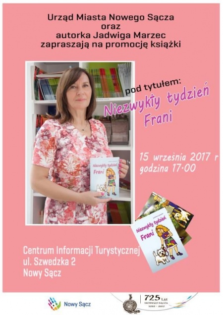 "Niezwykły tydzień Frani" to pełna uroku książka adresowana nie tylko dla dzieci. Na spotkanie promujące najnowszą propozycję wydawniczą Jadwigi Marzec zapraszają autorka i Urząd Miasta Nowego Sącza. Spotkanie odbędzie się 15 września (piątek) w Centrum Informacji Turystycznej w Nowym Sączu.