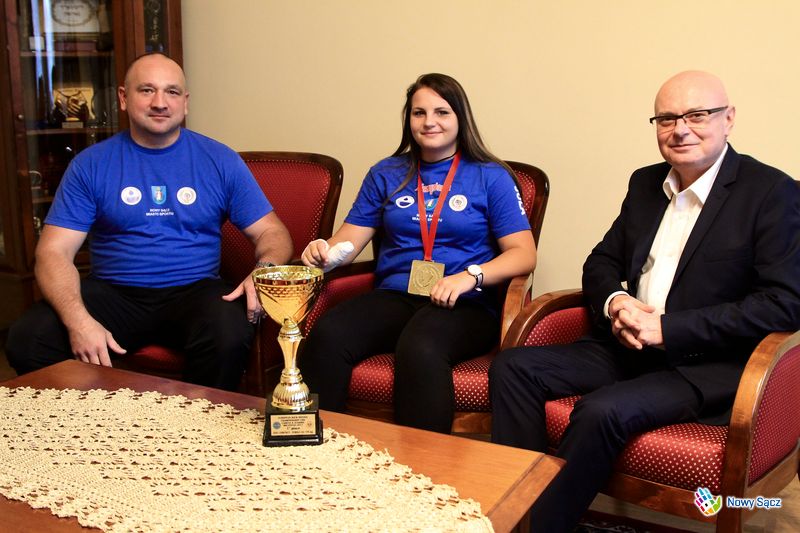 W sądeckim ratuszu odbyło się spotkanie prezydenta Ryszarda Nowaka z Jolantą Cichoń z UKS Evan oraz trenerem klubu Krzysztofem Bulandą. Sądecka zawodniczka w miniony weekend zdobyła w Skopje (Macedonia) tytuł Mistrzyni Europy w Kickboxingu juniorek w kategorii +70 kg i w formule full contact. - Serdecznie gratuluję wygranej i tytułu Mistrzyni Europy, ale dziękuję też za sportową opiekę trenerowi. To kolejny tak znaczący sukces klubu, który promuje nasze miasto, dlatego czekamy na kolejne - mówił Ryszard Nowak.