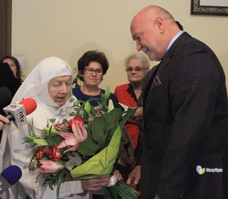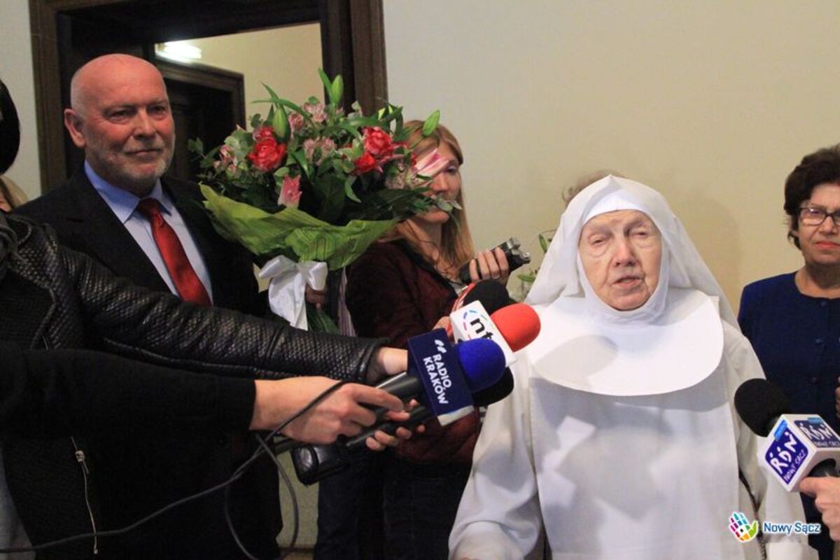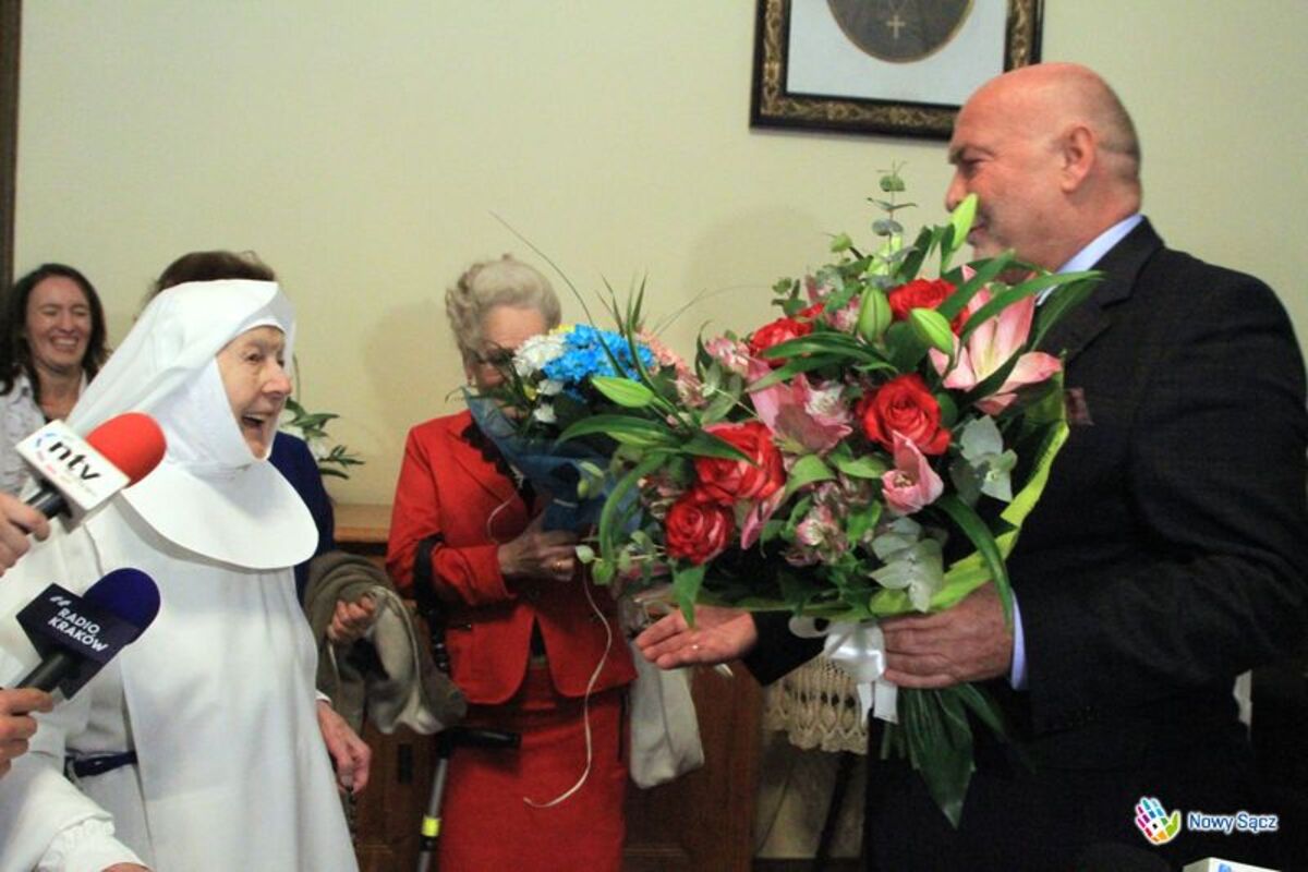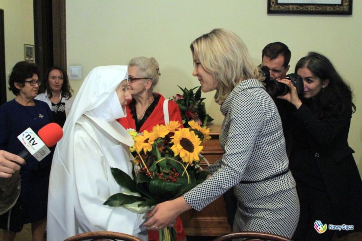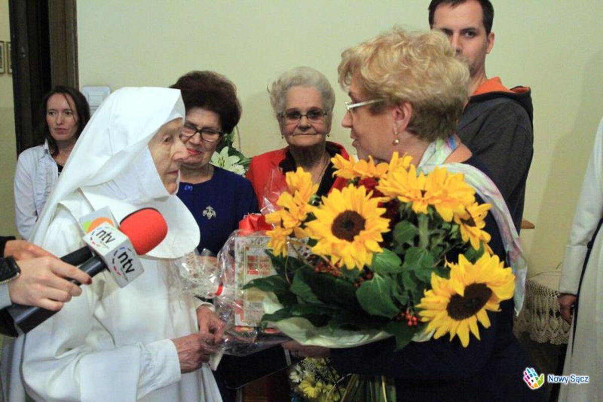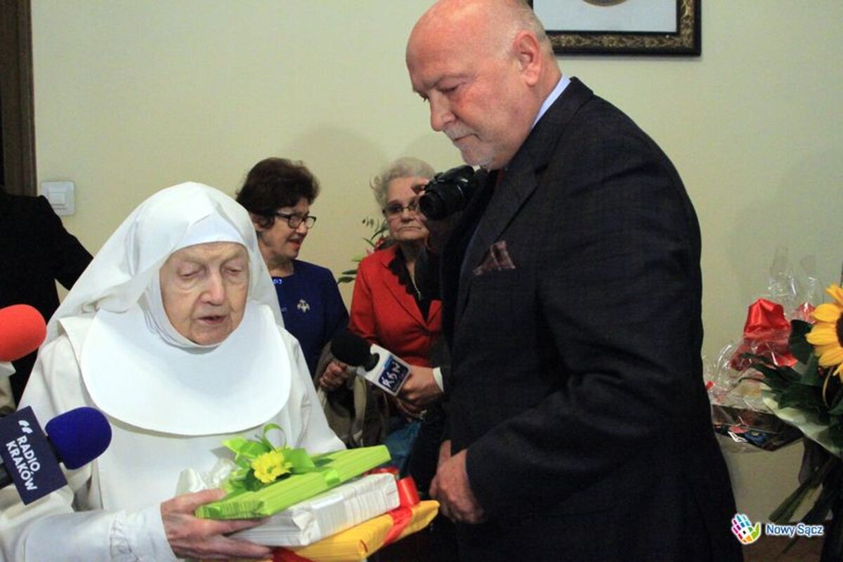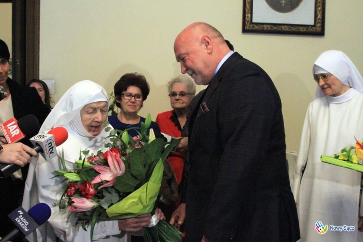 Kwiaty i upominki wręczyła jubilatce także przewodnicząca Rady Miasta Nowego Sącza Bożena Jawor. - Z ogromną radością tutaj przychodzę i cieszę się, że zastaję siostrę w takim wspaniałym zdrowiu – powiedziała przewodnicząca. – Jest siostra przykładem, jak należy brać radość życia. Tego się powinniśmy od siostry uczyć.