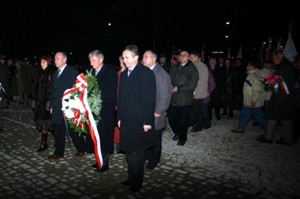 Po mszy liczne poczty sztandarowe zakładowych i branżowych związków zawodowych „Solidarność”, szkół, organizacji kombatanckich, gospodarze miasta i powiatu, byli i obecni członkowie związku zgromadzili się przed pomnikiem. Przewodniczący Rady Miasta Jacek Chronowski, wiceprzewodniczący Zarządu Regionu Małopolska NSZZ „Solidarność” Andrzej Szkaradek mówili o wydarzeniach sprzed 25 lat, o ich znaczeniu dla dzisiejszej Polski i Europy.