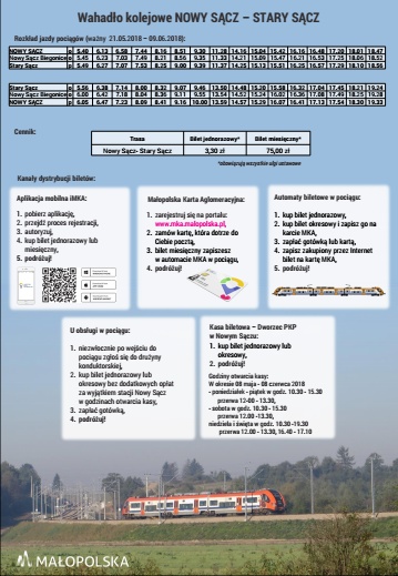 Rozkład ważny jest od 21 maja do 9 czerwca włącznie. Na trasie kursują 32 pociągi. Od 10 czerwca linia zostanie wydłużona do Rytra, a liczba składów powiększy się o dodatkowe 14 składów. Pociągi kursują średnio co pół godziny. Bilet jednorazowy kosztuje 3,30 zł, miesięczny - 75 zł. Szczegóły na rozkładzie jazdy /poniżej/.