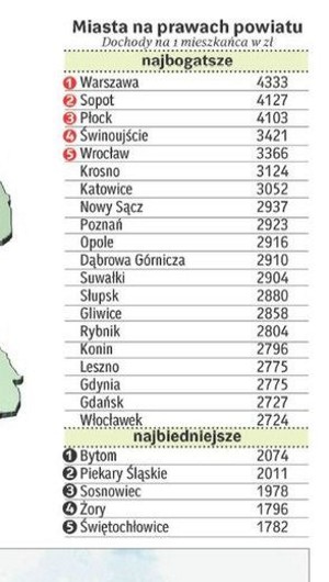 W rankingu przewodzi Warszawa. Po stolicy, na drugim miejscu pod względem bogactwa znajduje się Sopot, liczący 40,5 tys. mieszkańców, a następnie 130-tysięczny Płock, których dochód wynosił ponad 4,1 tys. zł na osobę, a także 40-tysięczne portowe Świnoujście z wpływami w wysokości 3,4 tys. zł na mieszkańca.