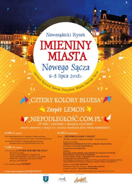 Podczas tegorocznych Imienin Miasta, w dniach 6, 7 i 8 lipca, na sądeckim rynku wystąpi m.in. zespół LemON, orkiestra Mieczysława Smydy, Beata Rybotycka, Wojciech Cugowski, Kwartet Rampa, czy też Orkiestra Reprezentacyjna Straży Granicznej pod dyrekcją Leszka Mieczkowskiego.