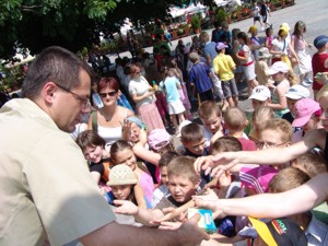 Przedwakacyjny happening z maluchami z sądeckich przedszkoli zorganizował przy współpracy z Urzędem Miasta znany plastyk Stanisław Szarek.