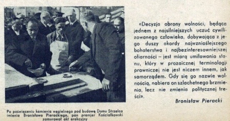 Kamień węgielny pod budowę Domu Strzeleckiego, został poświęcony 19 października 1935 roku. Wydarzyło się to po uroczystościach przeniesienia trumny z ciałem Bronisława Pierackiego z Cmentarza Komunalnego do mauzoleum poświęconego generałowi na Starym Cmentarzu, czyli tam, gdzie dziś ponownie spoczęła jego trumna.