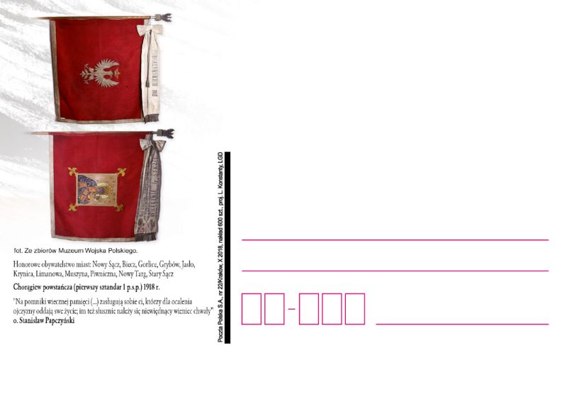 Karta została wydana z okazji uroczystości, które odbędą się w Nowym Sączu 31 października. Wtedy to w Basztę Kowalską sądeckiego zamku zostaną wmurowane odtworzone tablice z nazwiskami 194. poległych żołnierzy I Pułku Strzelców Podhalańskich, którzy walczyli o odzyskanie niepodległości w latach 1918-1920. Przed II wojną światową pod tablicami 15 sierpnia odbywały się uroczystości z okazji Dnia Żołnierza.