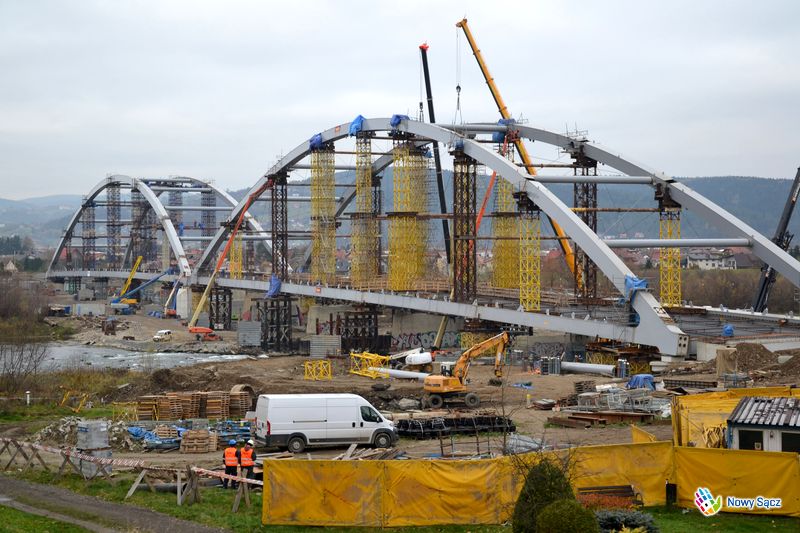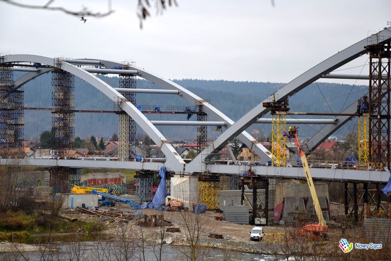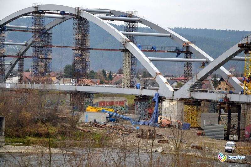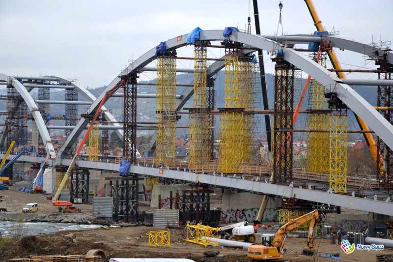 - Od strony dzielnicy Helena montaż łuków jest ukończony i trwają prace związane z demontażem podpór tymczasowych pod łukami. Po wykonaniu wstępnego sprężenia obiektu i przystąpieniu do montażu odciągów, czyli lin, zostanie rozpoczęty montaż deskowania płyty pomostu oraz zbrojenia i jej betonowania. Podobna sytuacja będzie występować od strony zamku, po zakończeniu montażu łuków - mówi dyrektor Miejskiego Zarządu Dróg w Nowym Sączu Grzegorz Mirek i dodaje: