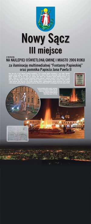 Jurorzy docenili iluminację multimedialną nowego kompleksu na rynku sądeckim – pomnika i fontanny papieskiej.