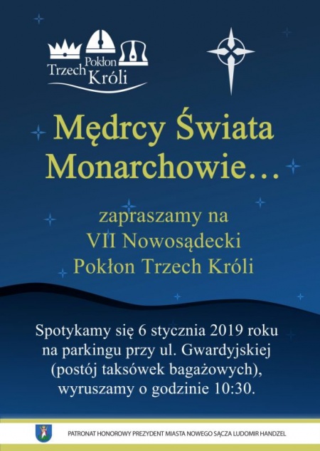 VII Nowosądecki Pokłon Trzech Króli wyruszy z parkingu przy ul. Gwardyjskiej (postój taksówek bagażowych) w niedzielę, 6 stycznia o godz. 10.35. Otworzy go Gwiazda Betlejemska z chorągwiami oraz paziowie i giermkowie z darami. Za nimi pojadą bryczką główni aktorzy widowiska: Kacper, Melchior i Baltazar, czyli Trzej Królowie (wcielą się w nich Jan Kożuch, Czesław Sarota i kleryk z Kamerunu).