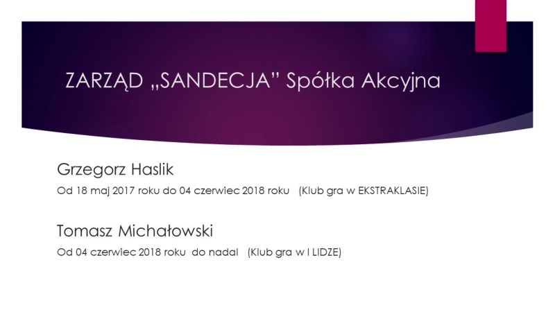 Zdaniem prezesa spółki, Tomasza Michałowskiego, mieszkańcy Nowego Sącza przyzwyczaili się, że Sandecja jest klubem miejskim i przez lata była utrzymywana przez miasto. - Stan spółki zostanie przedstawiony na najbliższej sesji Rady Miasta i rzeczywiście Rada będzie musiała wypowiedzieć się, w którym kierunku będziemy zmierzać. Czy zostawimy taką sytuację, jaka jest, że stuprocentowy ciężar prowadzenia tego klubu spoczywa na barkach miasta, czy być może będziemy szukać prywatnego inwestora, który w jakiejś części, a może w całości przejmie wydatki klubu z zachowaniem nazwy, herbu oraz miejsca, w którym będą odbywać się mecze.