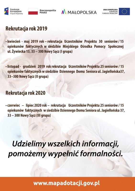 - kwiecień – maj 2019 - rekrutacja 30 seniorów/15 opiekunów faktycznych w siedzibie Miejskiego Ośrodka Pomocy Społecznej ul. Żywiecka 13, 33 - 300 Nowy Sącz (I grupa)