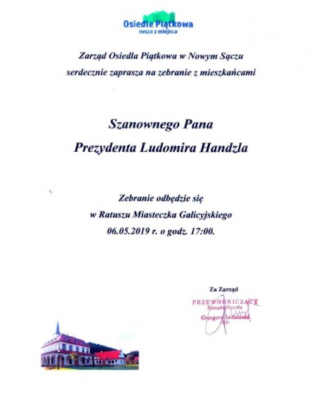 Prezydent Miasta Nowego Sącza Ludomir Handzel spotka się z mieszkańcami Osiedla Piątkowa. Spotkanie, które odbędzie się 6 maja o godzinie 17:00 w Miasteczku Galicyjskim, organizuje Przewodniczący Zarządu Osiedla Grzegorz Ledziński.