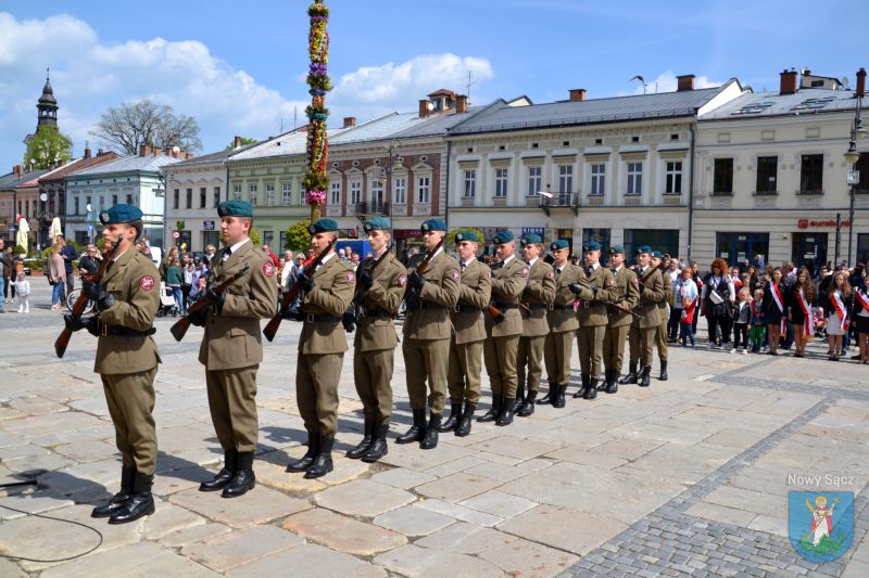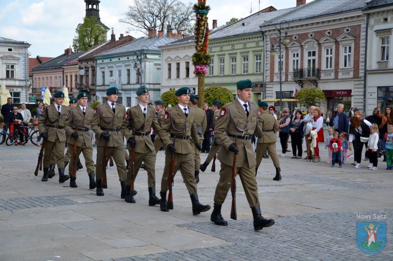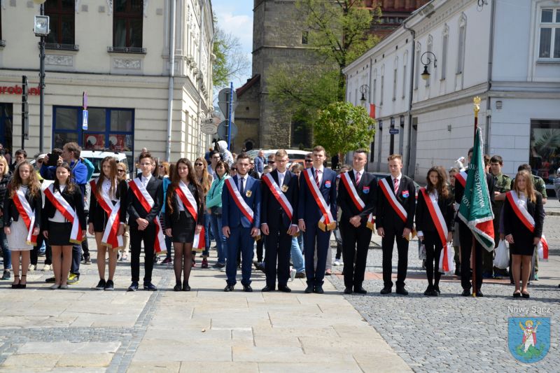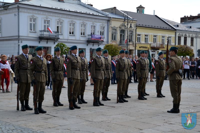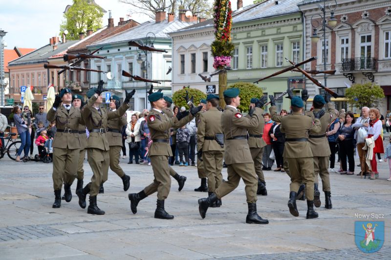 Zebrani na nowosądeckim Rynku mieli okazję obejrzeć pokaz musztry paradnej w wykonaniu uczniów klas mundurowych Zespołu Szkół nr 2 im. Sybiraków w Nowym Sączu, którzy działają w Związku Strzeleckim „Strzelec”.