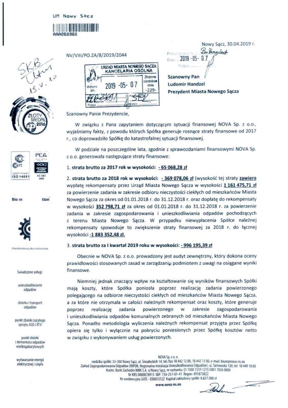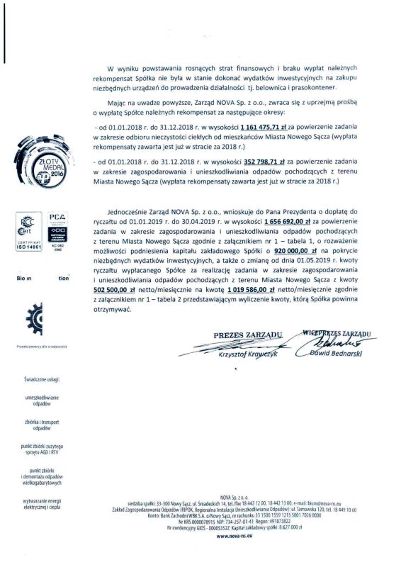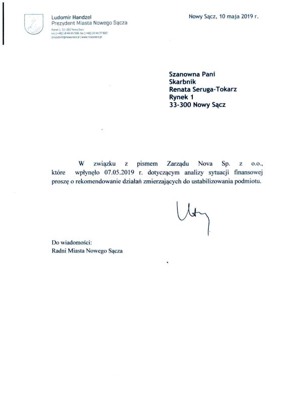 W związku z informacją przedstawioną przez Zarząd Spółki Nova, Prezydent Miasta Nowego Sącza Ludomir Handzel zwrócił się z prośbą do Skarbnik Miasta Nowego Sącza o rekomendowanie działań zmierzających do ustabilizowania tej spółki.