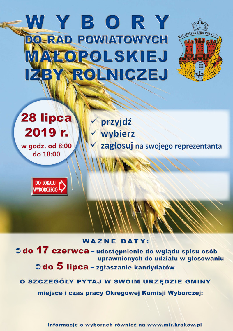 Małopolska Izba Rolnicza w Krakowie zawiadamia, że w niedzielę, 28 lipca odbędą się wybory do walnych zgromadzeń izb rolniczych. Chętni do pracy w Okręgowej Komisji Wyborczej nr 165 w okręgu Miasto Nowy Sącz mogą zgłaszać swoje kandydatury od piątku 24 maja do poniedziałku 3 czerwca 2019 r.