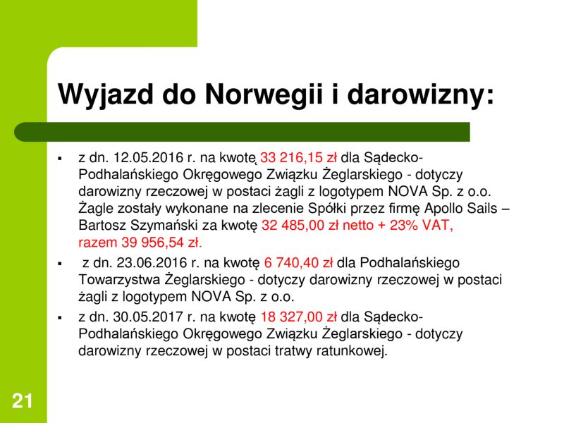 Podczas ostatniej sesji Rady Miasta Nowego Sącza prezes spółki NOVA Krzysztof Krawczyk zaprezentował radnym efekty przeprowadzonego w spółce audytu, który wykazał szereg nieprawidłowości. Należą do nich między innymi: nie mające uzasadnienia i nieprawidłowo rozliczane zagraniczne podróże członków Zarządu, finansowanie studiów MBA wiceprezes oraz przekazanie darowizny w postaci żagli i tratwy Sądecko - Podhalańskiemu Towarzystwu Żeglarskiemu.