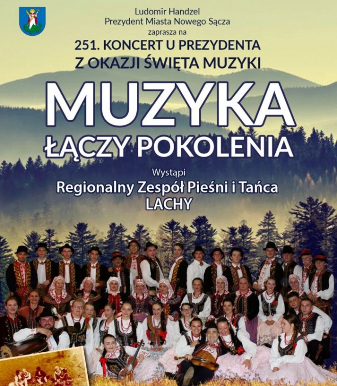 Prezydent Miasta Nowego Sącza Ludomir Handzel zaprasza na koncert Regionalnego Zespołu Pieśni i Tańca LACHY, który odbędzie się 4 lipca 2019 roku o godz. 18:00 w Sali Reprezentacyjnej sądeckiego ratusza.