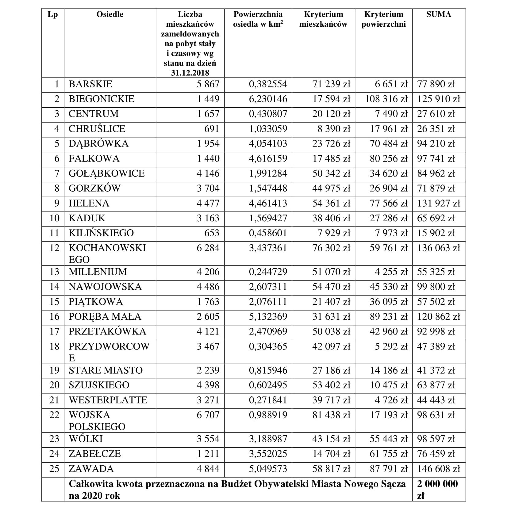 Kwoty przypadające dla każdego osiedla w ramach Budżetu Obywatelskiego Miasta Nowego Sącza na 2020 rok