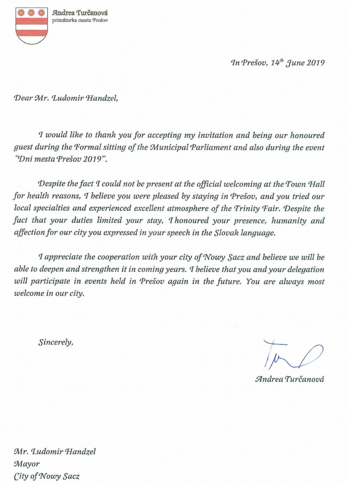 - Chciałabym podziękować za przyjęcie mojego zaproszenia i bycie honorowym gościem posiedzenia Rady Miasta Preszowa oraz Dni Miasta Preszowa 2019 – pisze burmistrz Preszowa Andrea Turčanová. – Doceniam współpracę między naszymi miastami i mam nadzieję, że w najbliższych latach będziemy mogli ją wzmocnić. Jest Pan zawsze mile widziany w naszym mieście.