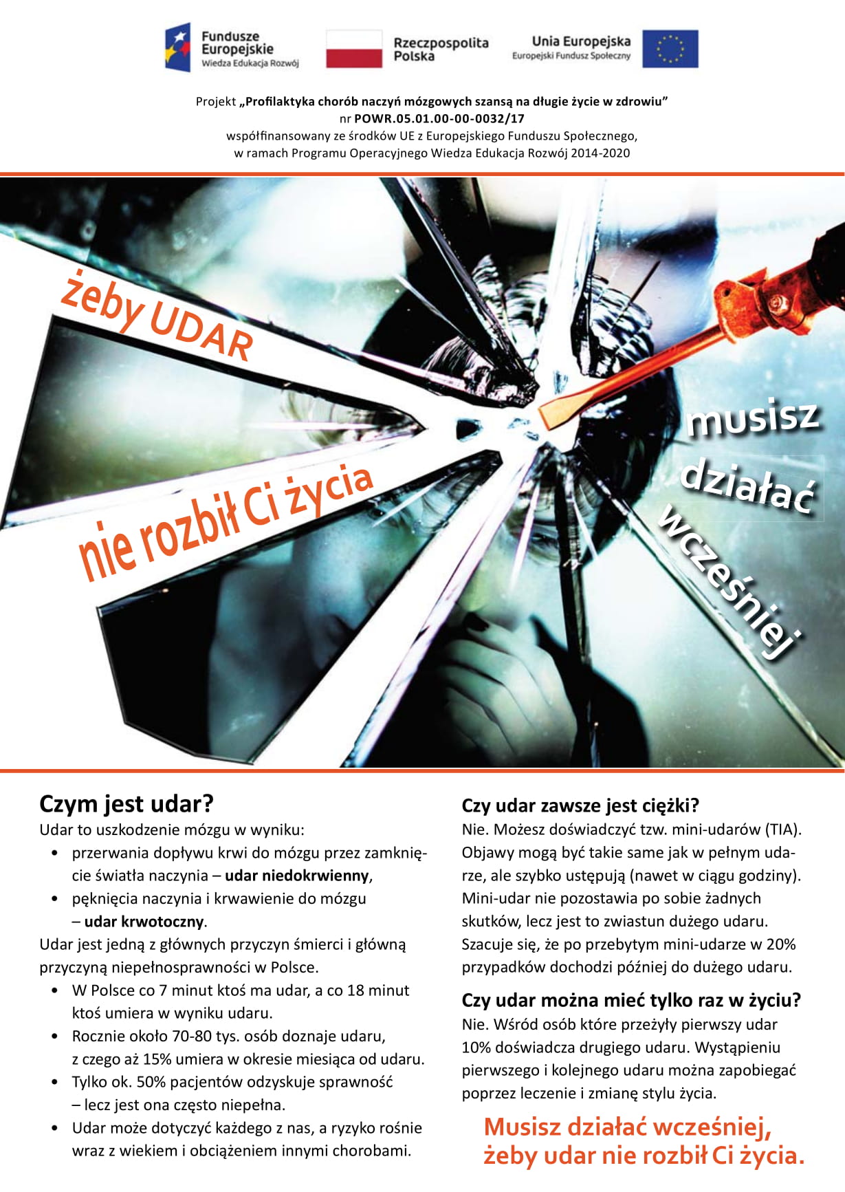 Szpital Uniwersytecki w Krakowie w okresie od 1 listopada 2017 roku do 30 października 2020 roku realizuje projekt pn. "Profilaktyka chorób naczyń mózgowych szansą na długie życie w zdrowiu". Program adresowany jest do osób zagrożonych udarem mózgu. Sprawdź, czy jesteś w grupie ryzyka!