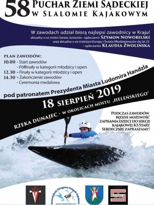 Prezydent Ludomir Handzel zaprasza na 58 Puchar Ziemi Sądeckiej w Slalomie Kajakowym. Zawody rozpoczną się 18 sierpnia o godzinie 10:00 startem kwalifikacyjnym, pod nowo wybudowanym mostem Heleńskim na prawym brzegu Dunajca.