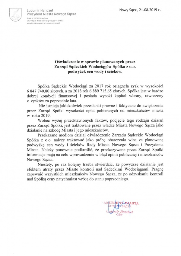 Prezydent Ludomir Handzel sprzeciwia się planowanym przez Zarząd Sądeckich Wodociągów Spółka z o.o. podwyżkom cen wody i ścieków. W swoim oświadczeniu podkreśla, że Spółka Sądeckie Wodociągi za 2017 rok osiągnęła zysk w wysokości 6 847 740,80 złotych, a za 2018 rok 6 889 715,65 złotych.