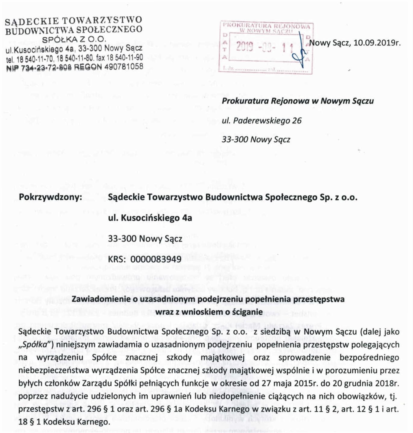 10 września 2019 roku Prezes Zarządu STBS Sp. z o.o. złożył zawiadomienie do Prokuratury Rejonowej w Nowym Sączu o uzasadnionym podejrzeniu popełnienia przestępstw, polegających na wyrządzeniu Spółce znacznej szkody majątkowej przez byłych członków Zarządu Spółki, w okresie 27 maja 2015 roku do 20 grudnia 2018 roku.