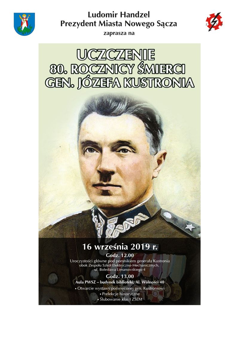 80 lat temu, 16 września 1939 roku, zginął gen. Józef Kustroń. Bohaterski dowódca poległ, próbując wyprowadzić swoje oddziały z niemieckiego okrążenia, pod wsią Ułazów na Lubelszczyźnie. W rocznicę śmierci gen. Kustronia odbędą się uroczystości, na które zaprasza Prezydent Nowego Sącza Ludomir Handzel.