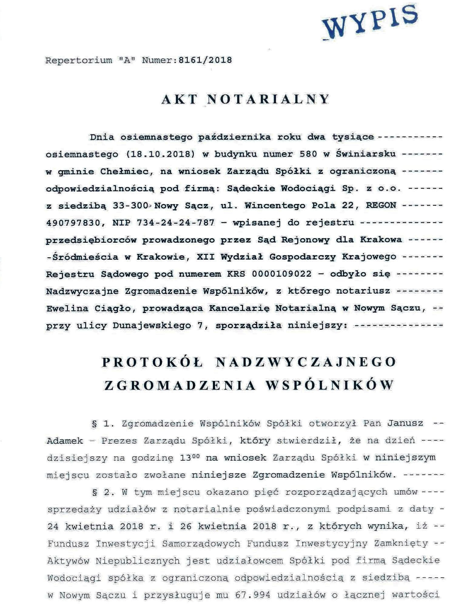 W związku z publikacją nieprawdziwych informacji na stronie internetowej jednej z sądeckich telewizji informujemy, że Nadzwyczajne Zgromadzenie Wspólników, na którym dokonano podwyższenia kapitału zakładowego Spółki, zmiany umowy Spółki i uchwalenia tekstu jednolitego Spółki, odbyło się 18 października 2018 roku.