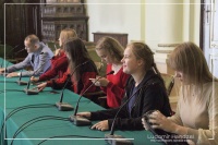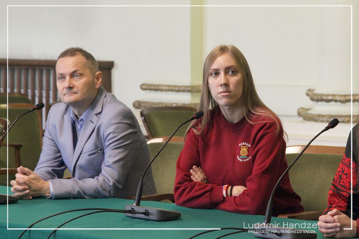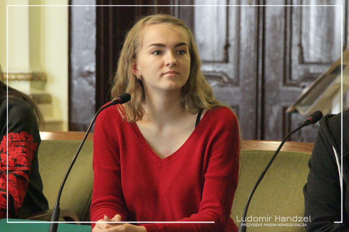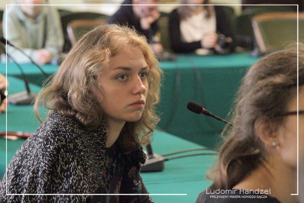 - Witam was bardzo serdecznie w sali obrad Rady Miasta Nowego Sącza – powiedziała na wstępie wiceprezydent miasta Magdalena Majka. – Bardzo się cieszę, że właśnie dzisiaj możemy spotkać, ponieważ macie okazję siedzieć przy stołach w takiej samej konfiguracji, w takim samym ułożeniu stołów, jak radni miasta Nowego Sącza podczas obrad. Jak widzicie, sala ratuszowa jest salą zabytkową, bardzo pięknym miejscem, i jest wykorzystywana do różnych wydarzeń, nie tylko do posiedzeń Rady Miasta. Odbywają się tutaj również śluby, koncerty, wykłady i inne wydarzenia – wyjaśniała pani wiceprezydent.