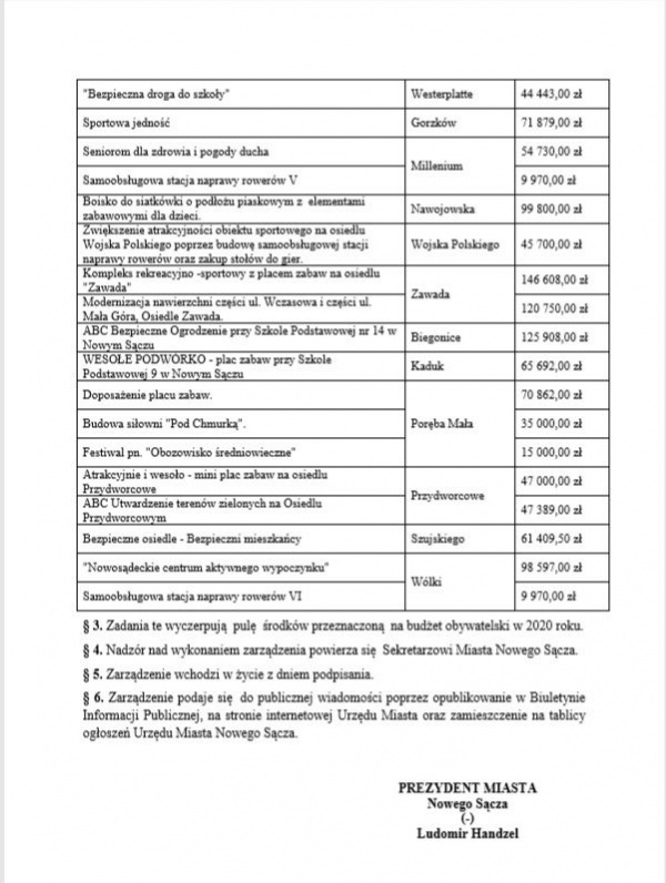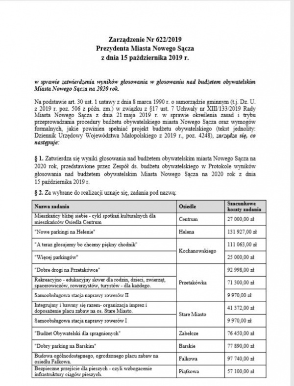 Wyniki głosowania zatwierdzone. Prezydent Nowego Sącza Ludomir Handzel zarządzeniem nr 622/2019 z 15 października 2019 roku zatwierdził wyniki w głosowaniu nad budżetem obywatelskim miasta Nowego Sącza na rok 2020. Zobacz, które zadania zostały zatwierdzone do realizacji.