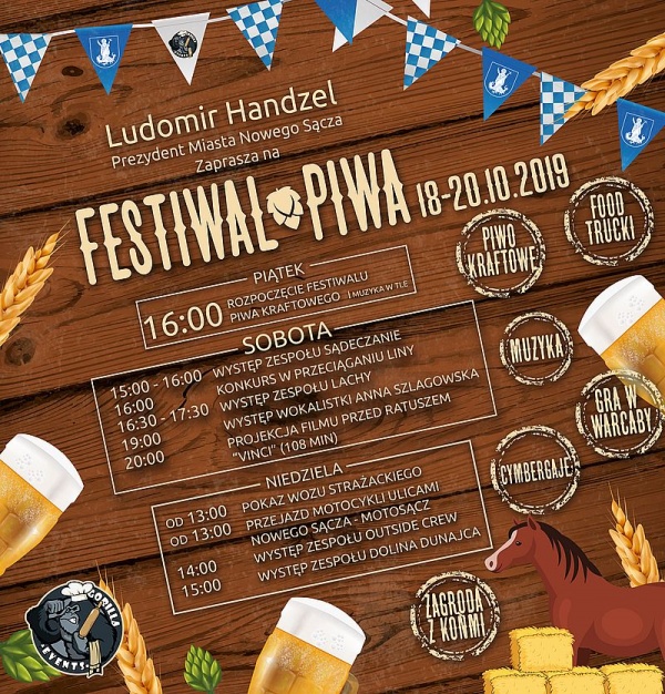 Będzie się działo! Prezydent Nowego Sącza Ludomir Handzel zaprasza na nową imprezę kulturalno – rozrywkową pod nazwą Festiwal Piwa (18 – 20 października). W programie znajdą się liczne koncerty, występy zespołów, konkursy i zabawy.