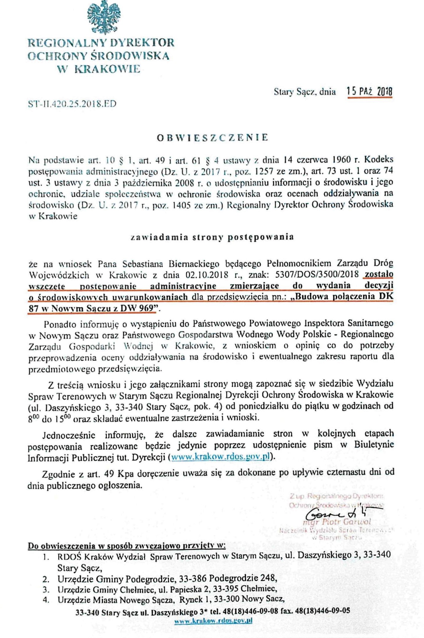 Dnia 15 października 2018 roku, a więc jeszcze przed rozpoczęciem nowej kadencji przez prezydenta Ludomira Handzla, po pozytywnym zaopiniowaniu wariantu ‘’C” przez wszystkie zainteresowane samorządy, Regionalny Dyrektor Ochrony Środowiska, na wniosek Zarządu Dróg Wojewódzkich w Krakowie wszczął postępowanie administracyjne, zmierzające do wydania decyzji o środowiskowych uwarunkowaniach dla przedsięwzięcia pn: „Budowa połączenia DK 87 w Nowym Sączu z DW 969”.