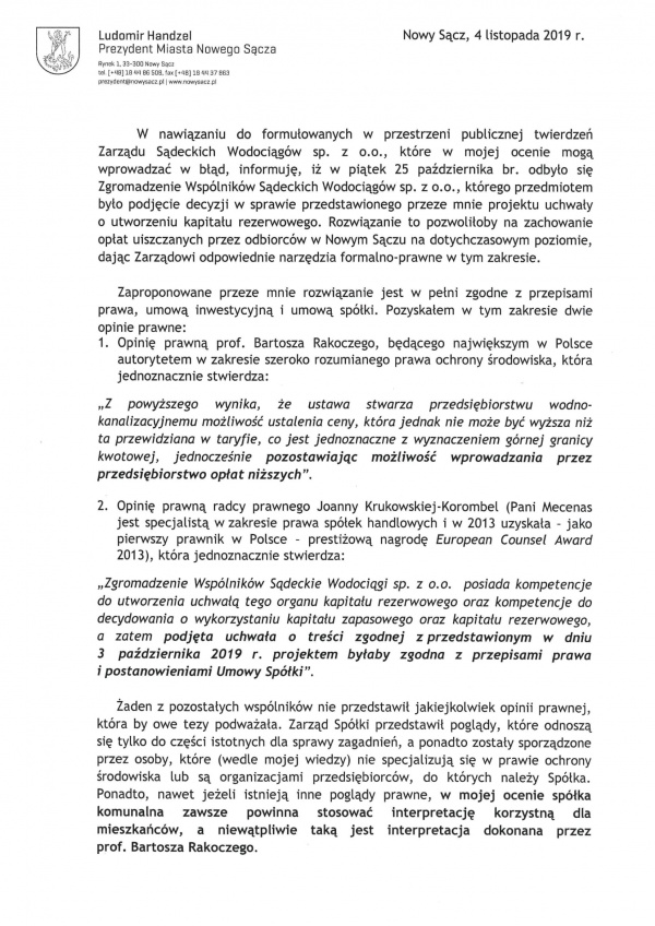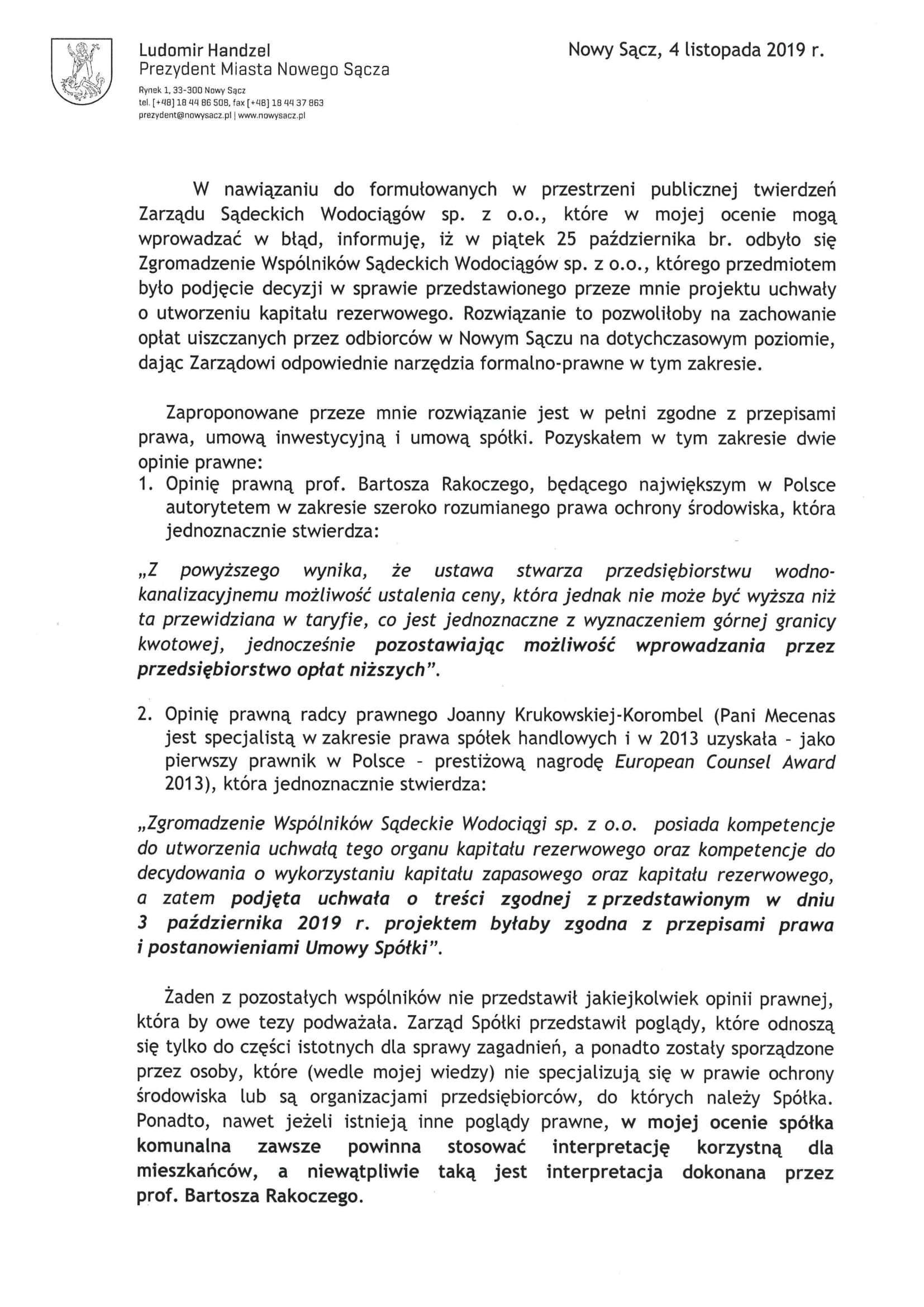 W swoim oświadczeniu Prezydent Ludomir Handzel odniósł się do formułowanych w przestrzeni publicznej twierdzeń Zarządu Sądeckich Wodociągów sp. z o.o., które mogą wprowadzać w błąd opinię publiczną. Prezydent podkreślił również, że proponowane przez niego utworzenie kapitału rezerwowego, pozwoliłoby na zachowanie opłat uiszczanych przez odbiorców w Nowym Sączu na dotychczasowym poziomie, dając Zarządowi odpowiednie narzędzia formalno-prawne w tym zakresie.