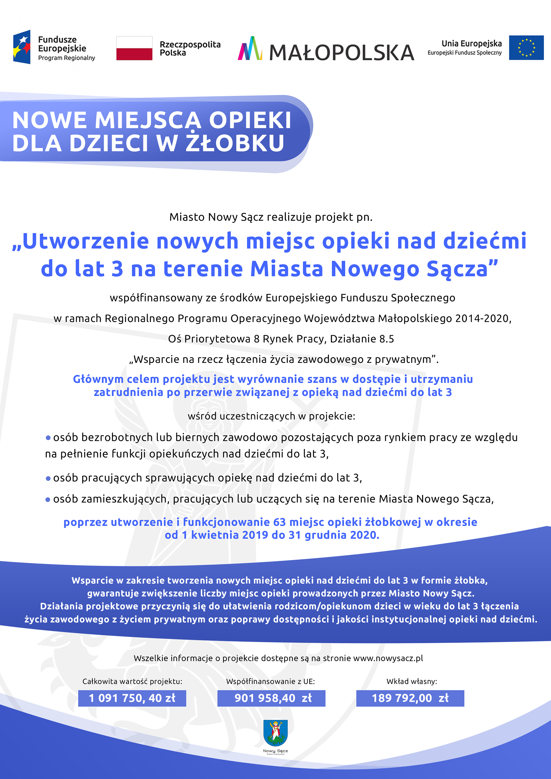 Urząd Miasta Nowego realizuje projekt pn. „Utworzenie nowych miejsc opieki nad dziećmi do lat 3 na terenie Miasta Nowego Sącza” współfinansowany ze środków Europejskiego Funduszu Społecznego w ramach Regionalnego Programu Operacyjnego Województwa Małopolskiego 2014-2020, Oś Priorytetowa 8 Rynek Pracy, Działanie 8.5 „Wsparcie na rzecz łączenia życia zawodowego z życiem prywatnym”.