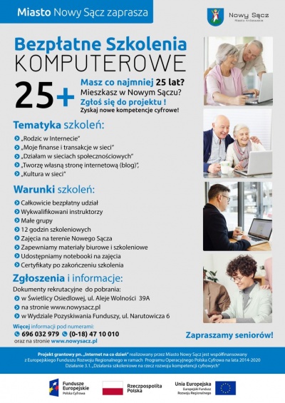 Miasto Nowy Sącz serdecznie zaprasza do wzięcia udziału w bezpłatnych szkoleniach komputerowych, które organizowane są w ramach projektu grantowego pn. „Internet na co dzień” współfinansowanego ze środków Europejskiego Funduszu Rozwoju Regionalnego w ramach Programu Operacyjnego Polska Cyfrowa na lata 2014-2020.