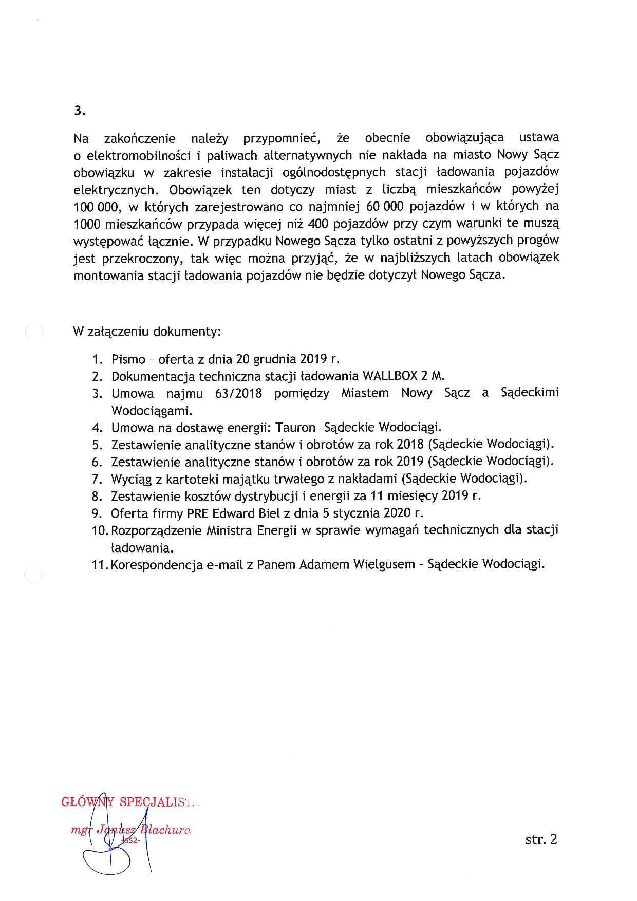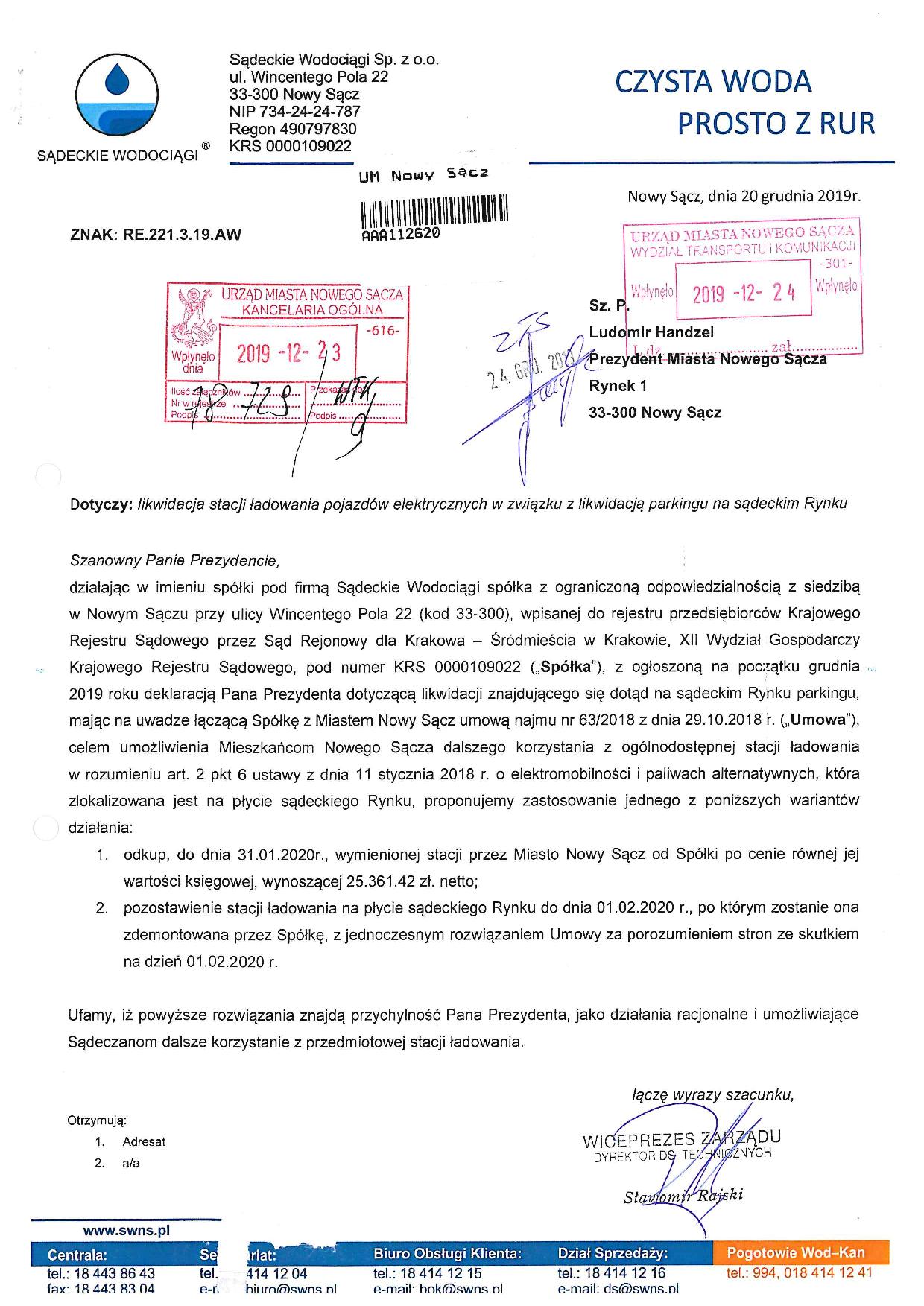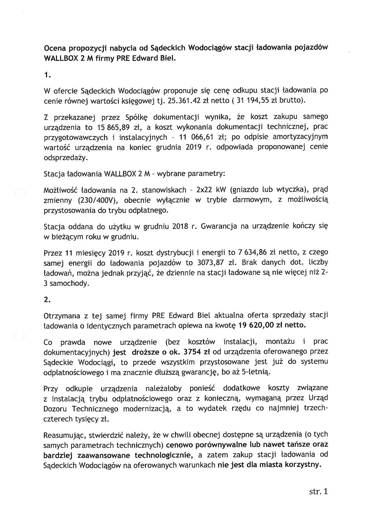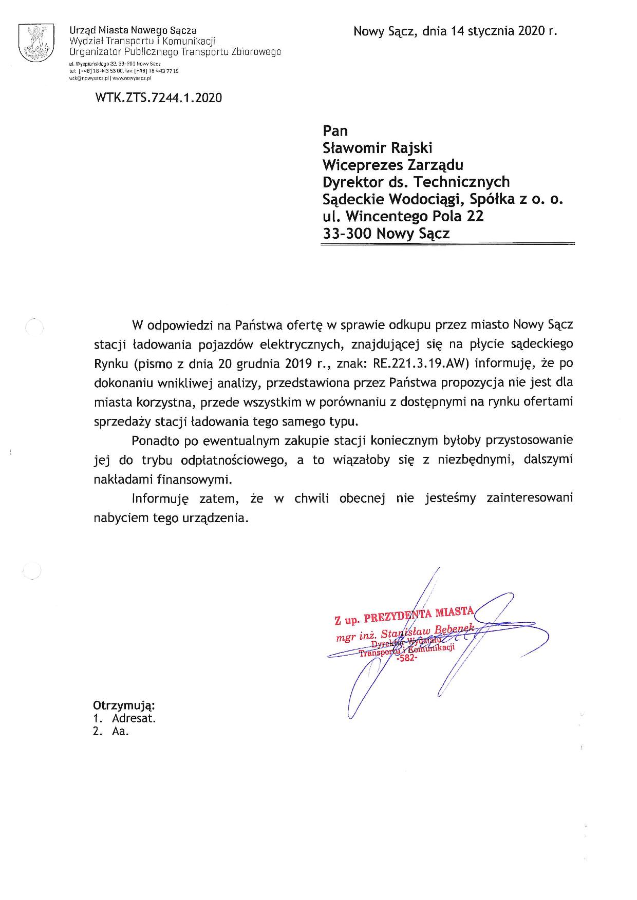 Urząd Miasta Nowego Sącza nie przychylił się do przyjęcia oferty odkupu stacji ładowania pojazdów, należącej do Sądeckich Wodociągów, znajdującej się na płycie sądeckiego Rynku. W chwili obecnej dostępne są urządzenia cenowo porównywalne lub tańsze, a także bardziej zaawansowane technologicznie. Propozycja złożona przez Spółkę Sądeckie Wodociągi, zakładająca odkup stacji ładowania za kwotę 25.361,42 zł netto jest zatem niekorzystna dla Miasta. Warto podkreślić, iż obowiązek montowania stacji ładowania pojazdów nie będzie w najbliższych latach dotyczył Nowego Sącza.