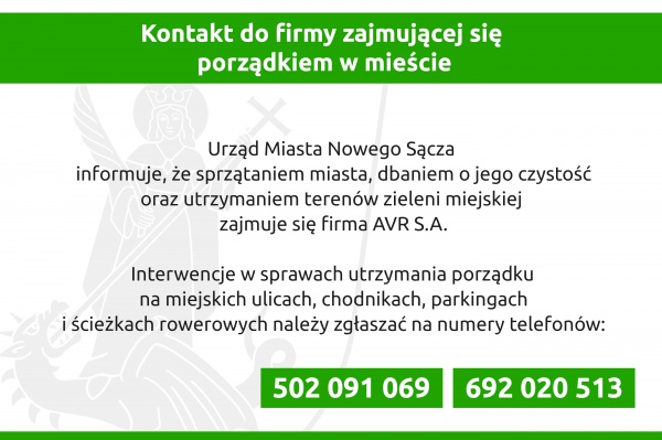 Urząd Miasta Nowego Sącza informuje, że sprzątaniem miasta, dbaniem o jego czystość oraz utrzymaniem terenów zieleni miejskiej zajmuje się firma AVR S.A. Interwencje w sprawach utrzymania porządku na miejskich ulicach, chodnikach, parkingach i ścieżkach rowerowych należy zgłaszać na numery telefonów: 502 091 069 i 692 020 513.