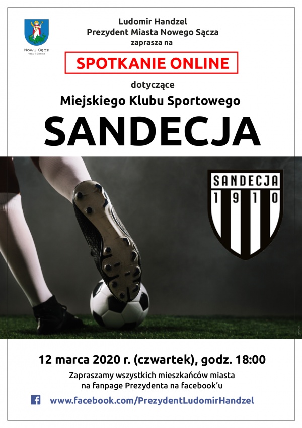 Prezydent Ludomir Handzel zaprasza wszystkich mieszkańców na spotkanie on-line , dotyczące Miejskiego Klubu „Sandecja”. Omówione zostaną między innymi kwestie, związane z dalszym funkcjonowaniem Klubu. Wydarzenie odbędzie się na funpage prezydenta na facebook’u w najbliższy czwartek (12 marca) o godz. 18:00. LINK.