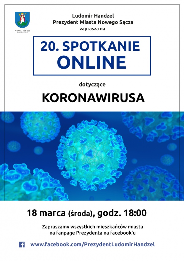 Prezydent Ludomir Handzel zaprasza wszystkich mieszkańców na spotkanie on-line. Omówiona zostanie aktualna sytuacja epidemiologiczna, związana z pandemią Koronawirusa. Zapraszamy na fanpage prezydenta, na facebook w środę (18 marca) o godz. 18:00.