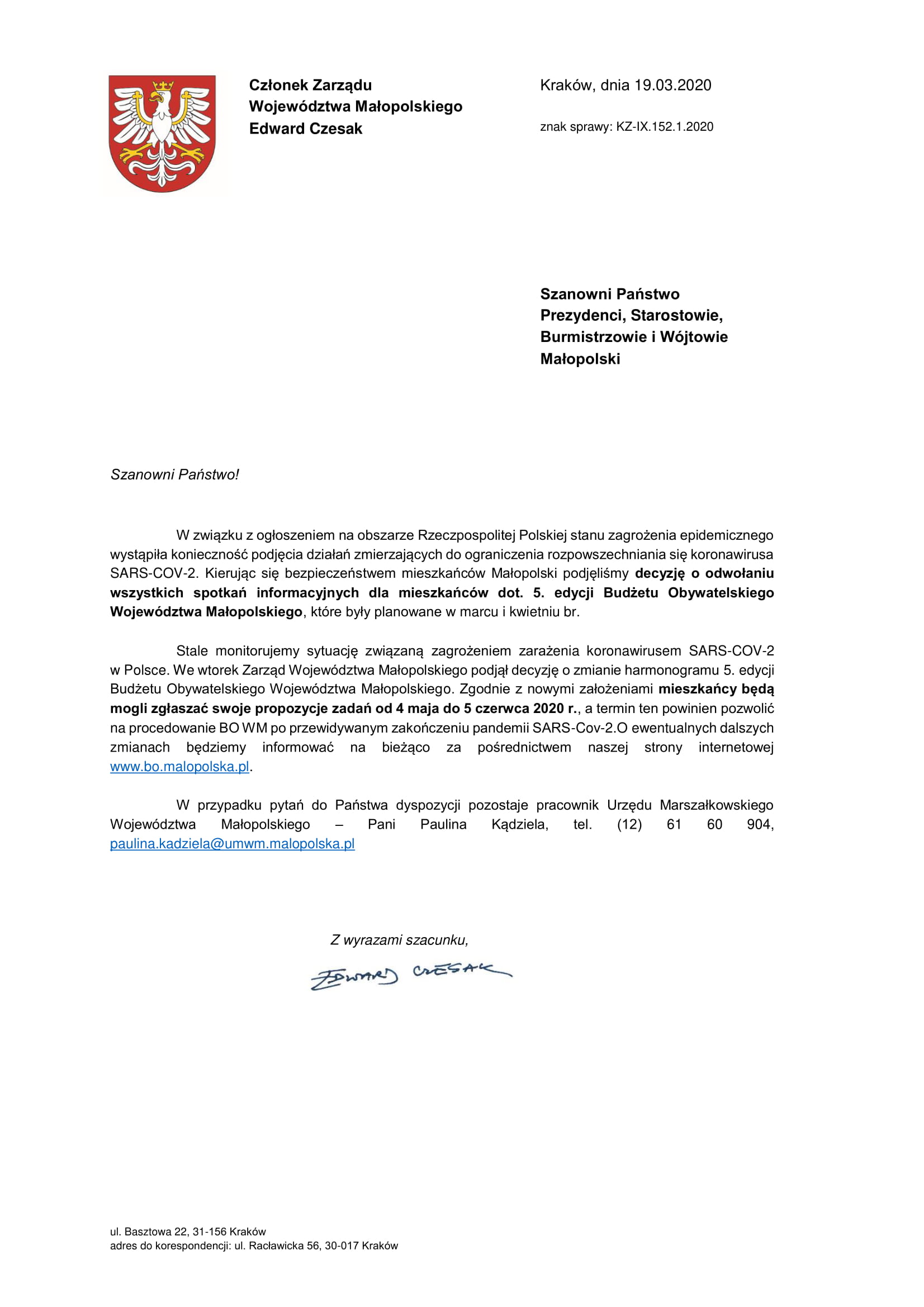 W związku z ogłoszeniem na obszarze Rzeczpospolitej Polskiej stanu zagrożenia epidemicznego i konieczności podjęcia działań zmierzających do ograniczenia rozpowszechniania się koronawirusa SARS-COV-2., odwołano wszystkie spotkania informacyjne dla mieszkańców, dotyczące 5. Edycji Budżetu Obywatelskiego Województwa Małopolskiego. Spotkania były planowane na marzec i kwiecień br.