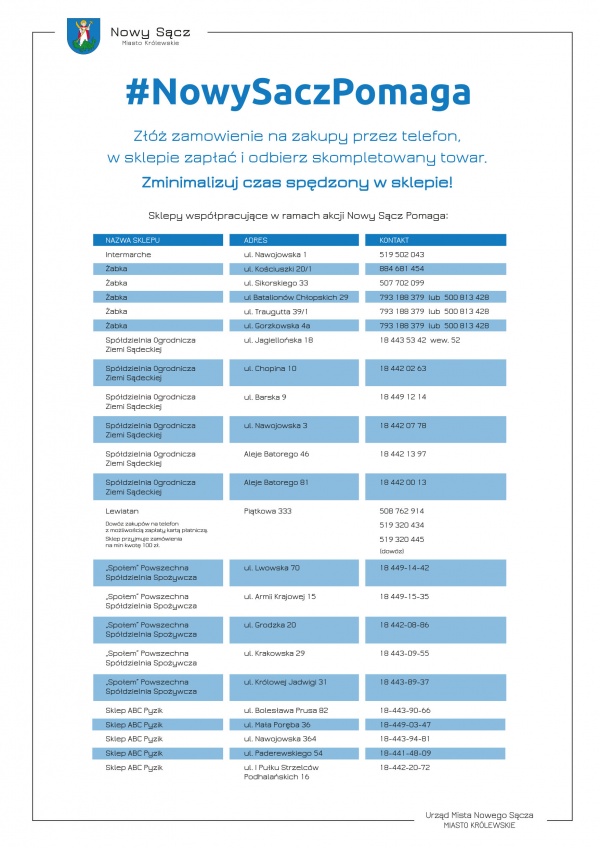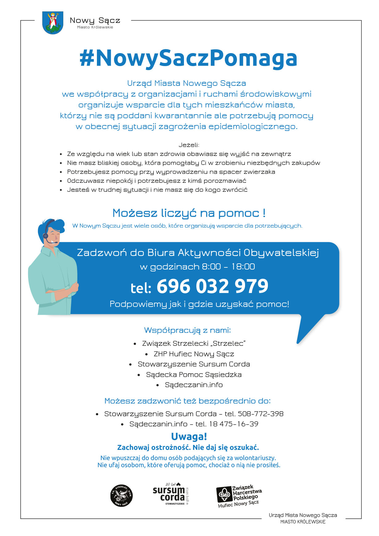 Urząd Miasta Nowego Sącza we współpracy z organizacjami i ruchami środowiskowymi organizuje wsparcie dla tych mieszkańców miasta, którzy nie są poddani kwarantannie ale potrzebują pomocy w obecnej sytuacji zagrożenia epidemiologicznego.