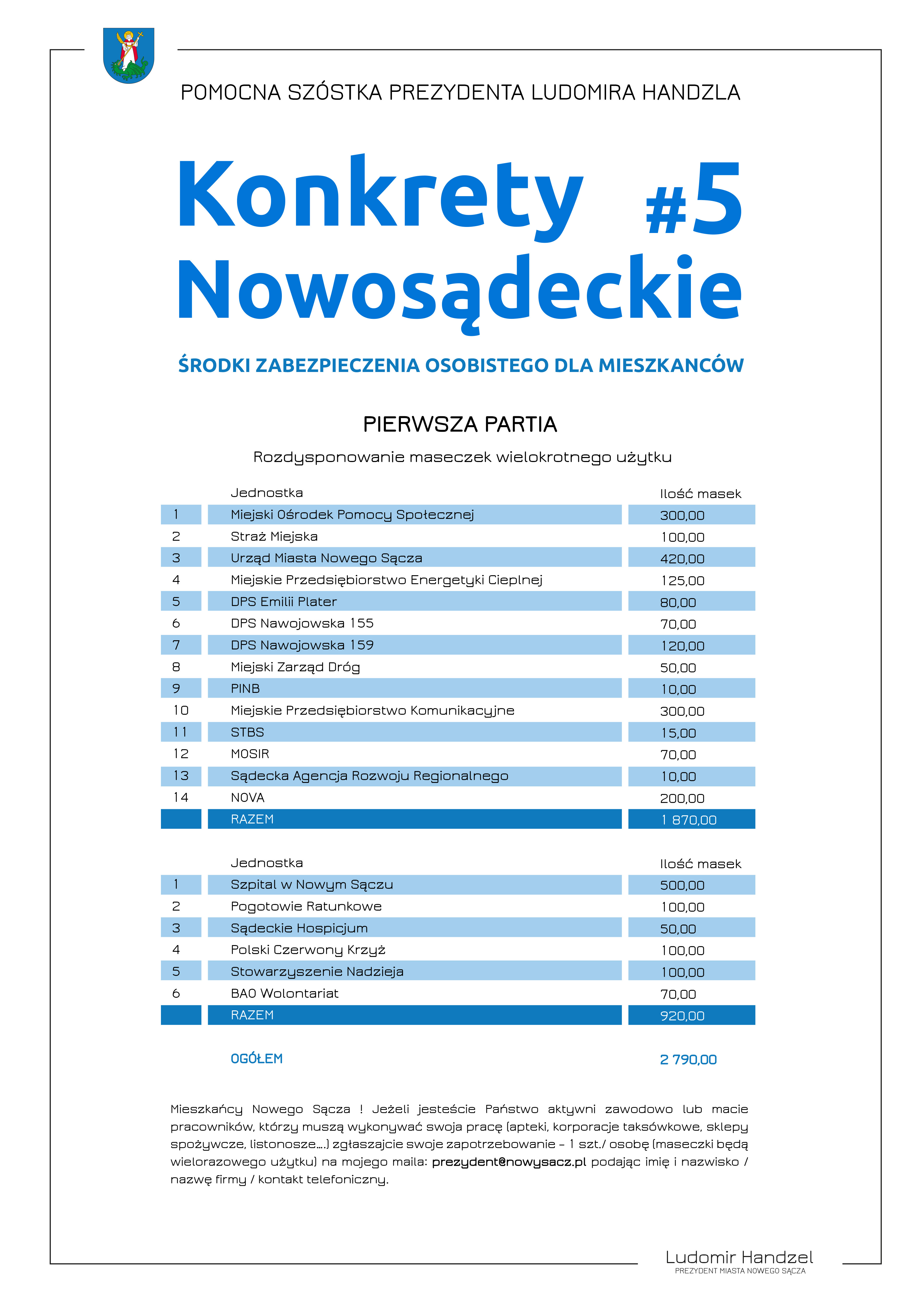 - Mieszkańcy Nowego Sącza ! Jeżeli jesteście Państwo aktywni zawodowo lub macie pracowników, którzy muszą wykonywać swoją pracę (apteki, korporacje taksówkowe, sklepy spożywcze, listonosze….) zgłaszajcie swoje zapotrzebowanie – 1 szt./ osobę (maseczki będą wielorazowego użytku) na mojego maila: prezydent@nowysacz.pl podając imię i nazwisko / nazwę firmy / kontakt telefoniczny - apeluje prezydent Ludomir Handzel.